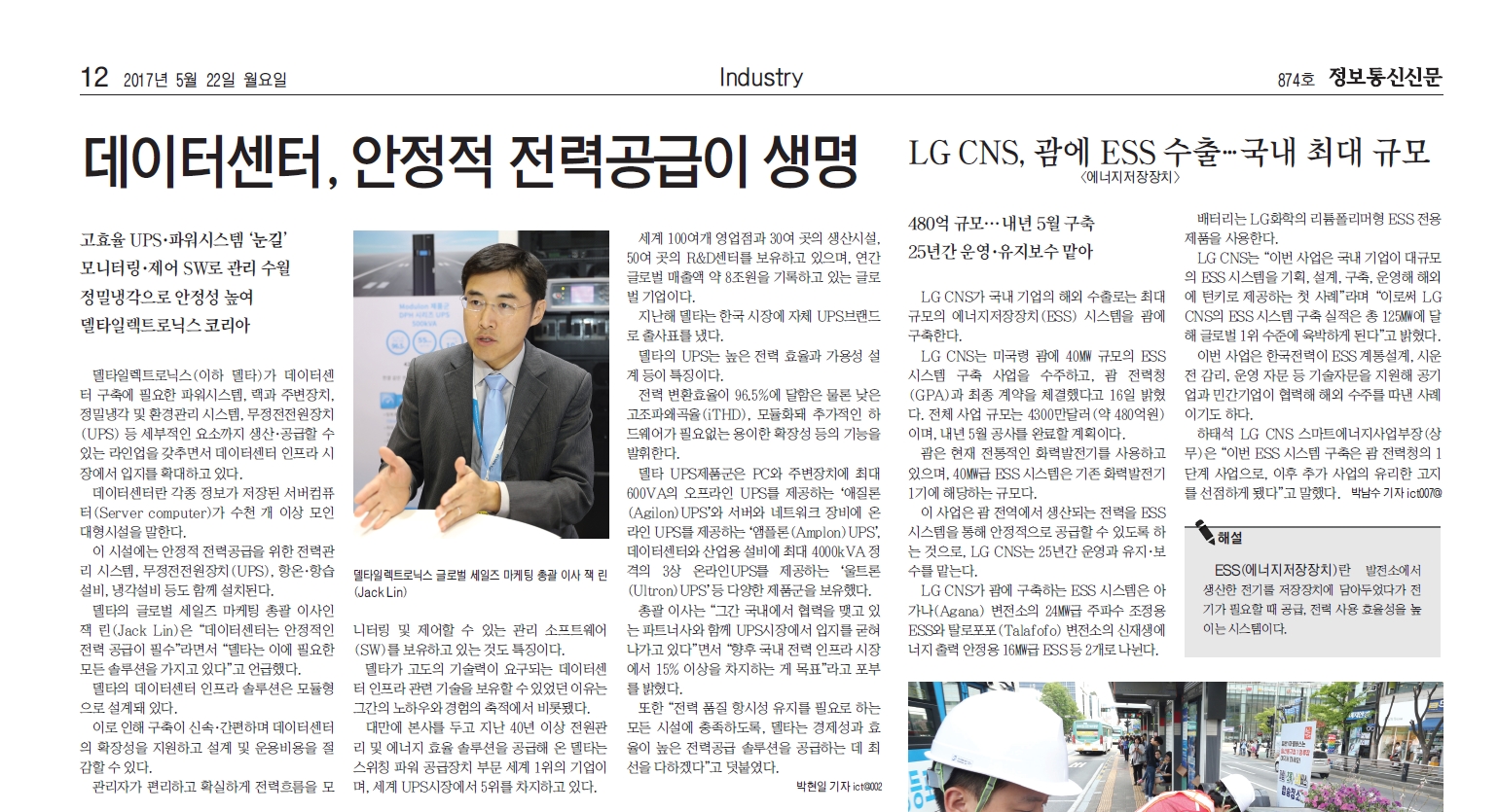 2017년 5월 23일 정보통신신문에 고효율UPS 데이타 센타. 안정적인 전력공급 델타일렉트리닉스 (델타) 한국시장 자체브랜드 진출... |